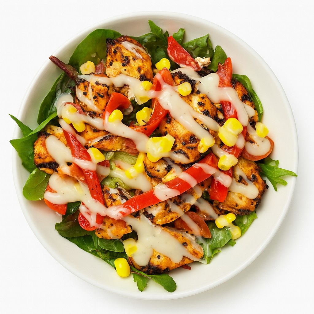 Grilled Chicken, Mixed Lettuce, Cherry Tomato, Avocado, Roasted Capsicum, Corn topped with Balsamic Mayo DressingSalad OPT