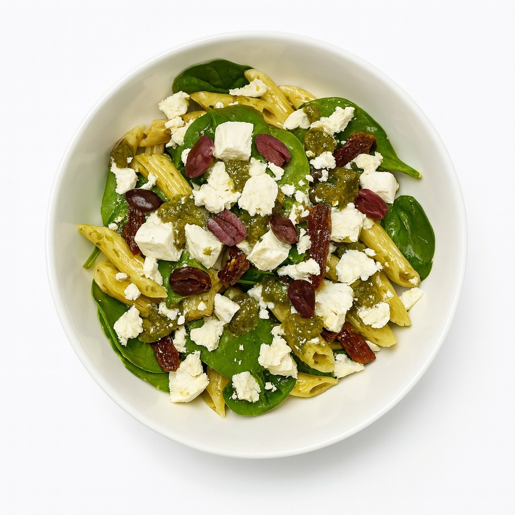 Penne, Pesto, Spinach, Sun Dried Tomato, Olives & FettaSalad OPT