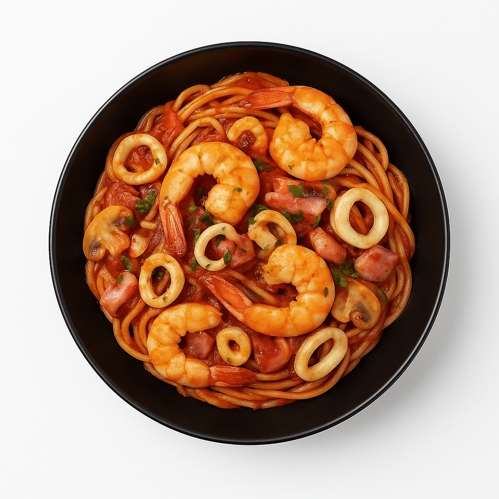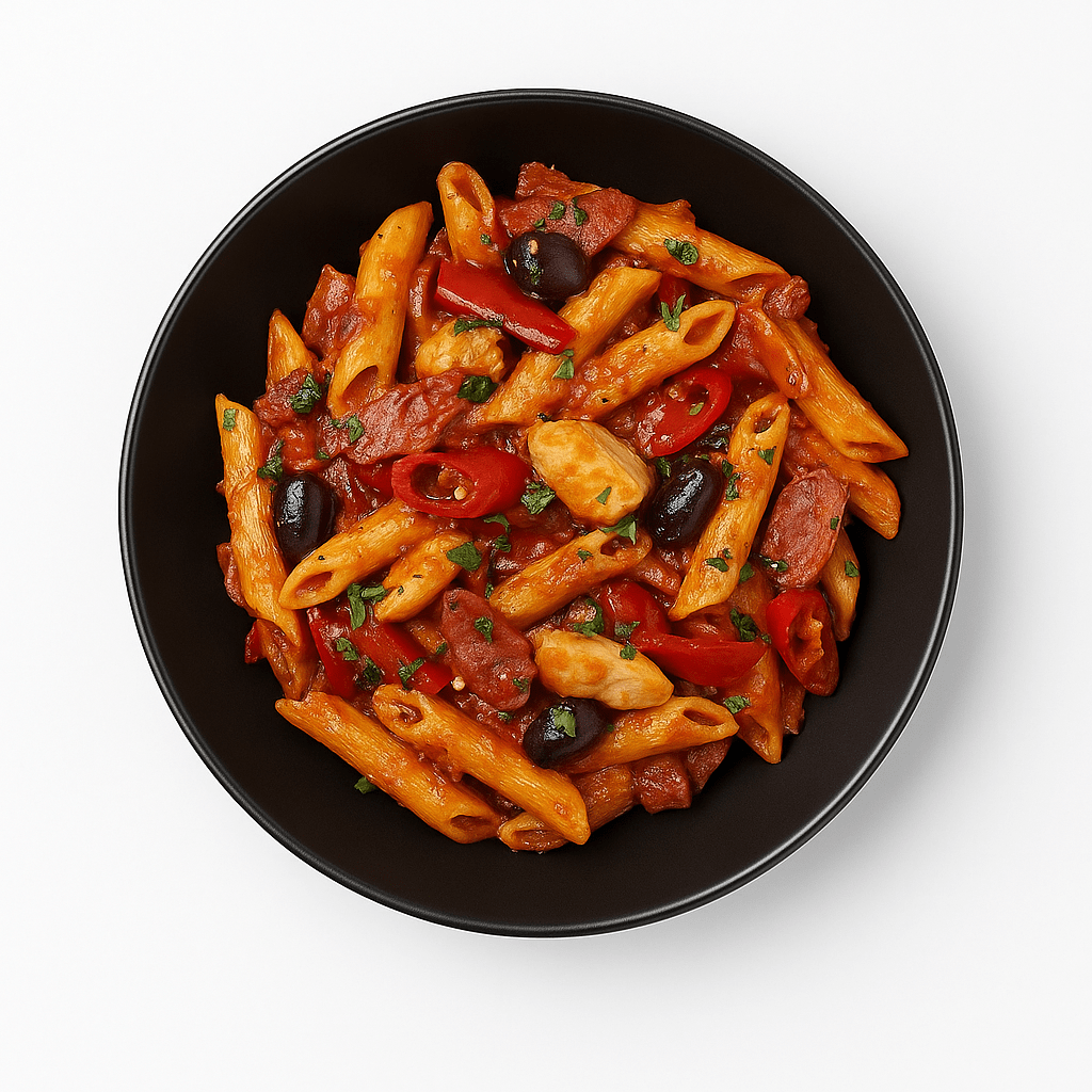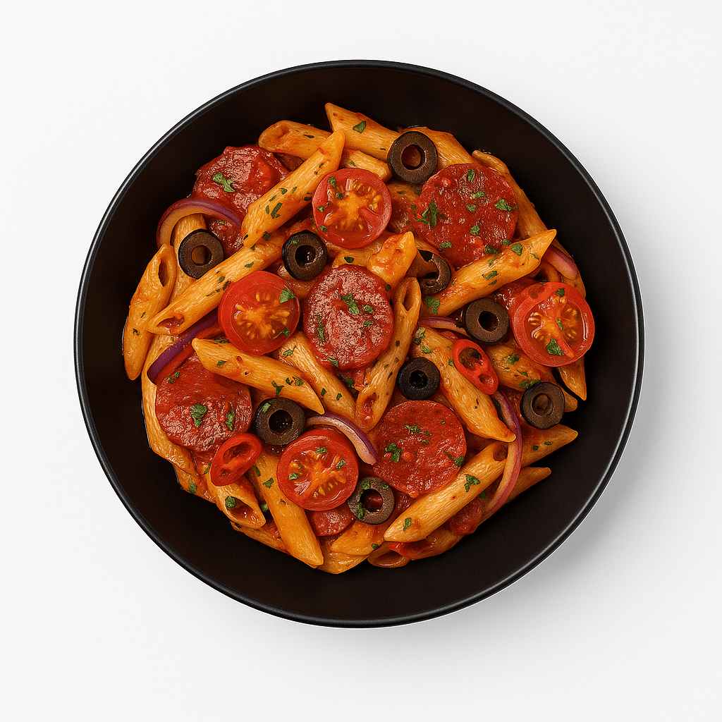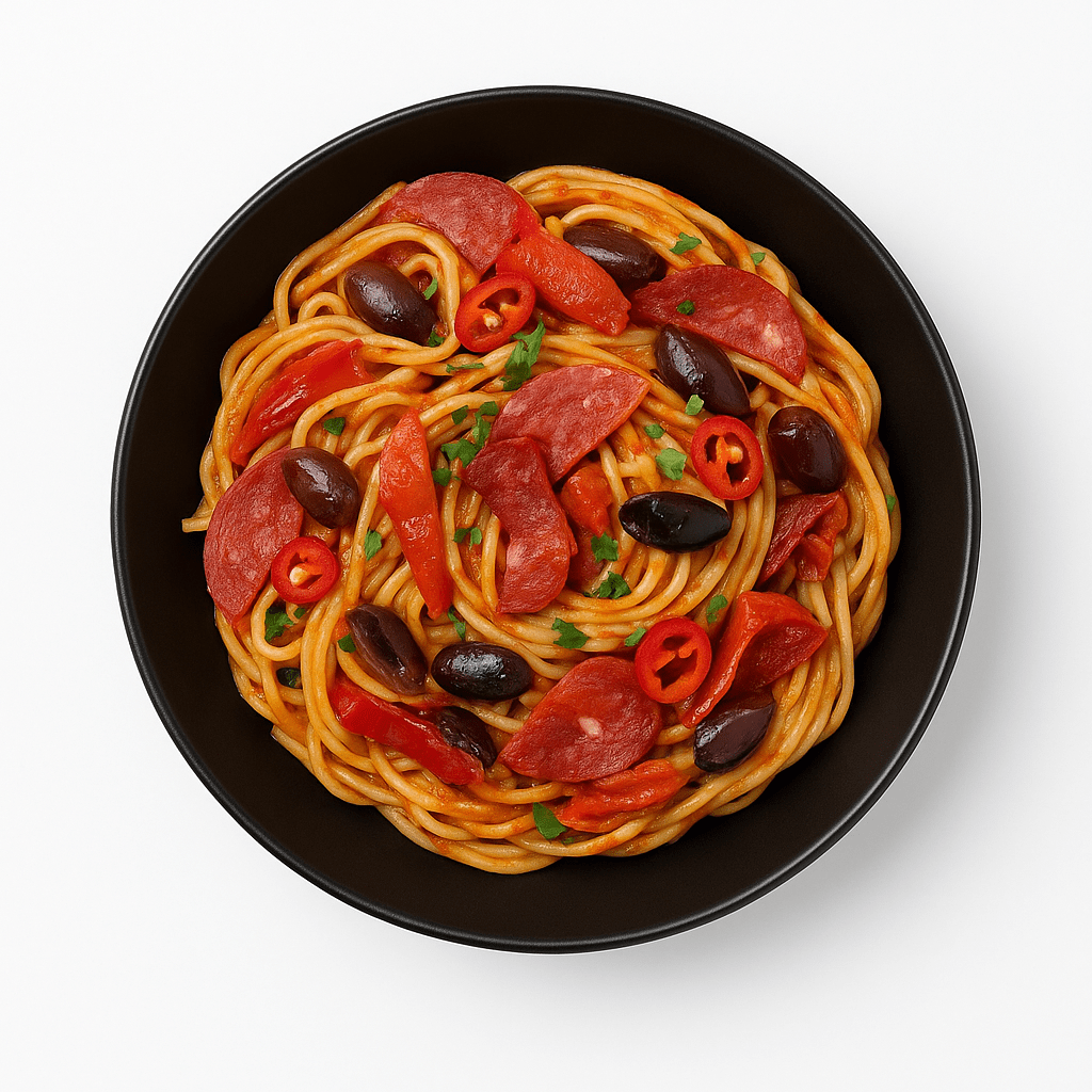 Salami, Sundried Tomato, Fresh Chilli, Olives, Roasted Peppers in Fresh Napoli SaucePasta Noodles