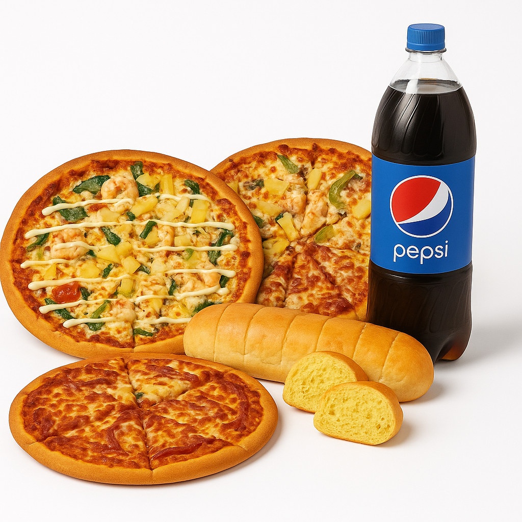 Party Combo$53.902 FAMILY TRADITIONAL PIZZAS + 2 GARLIC BREADS + 1.25L DRINK- Netflix Combo$62.901 LARGE TRADITIONAL PIZZA + 1 PASTA + 1 SMALL CHIPS + 1 SMALL NACHOS + 1.25L DRINK