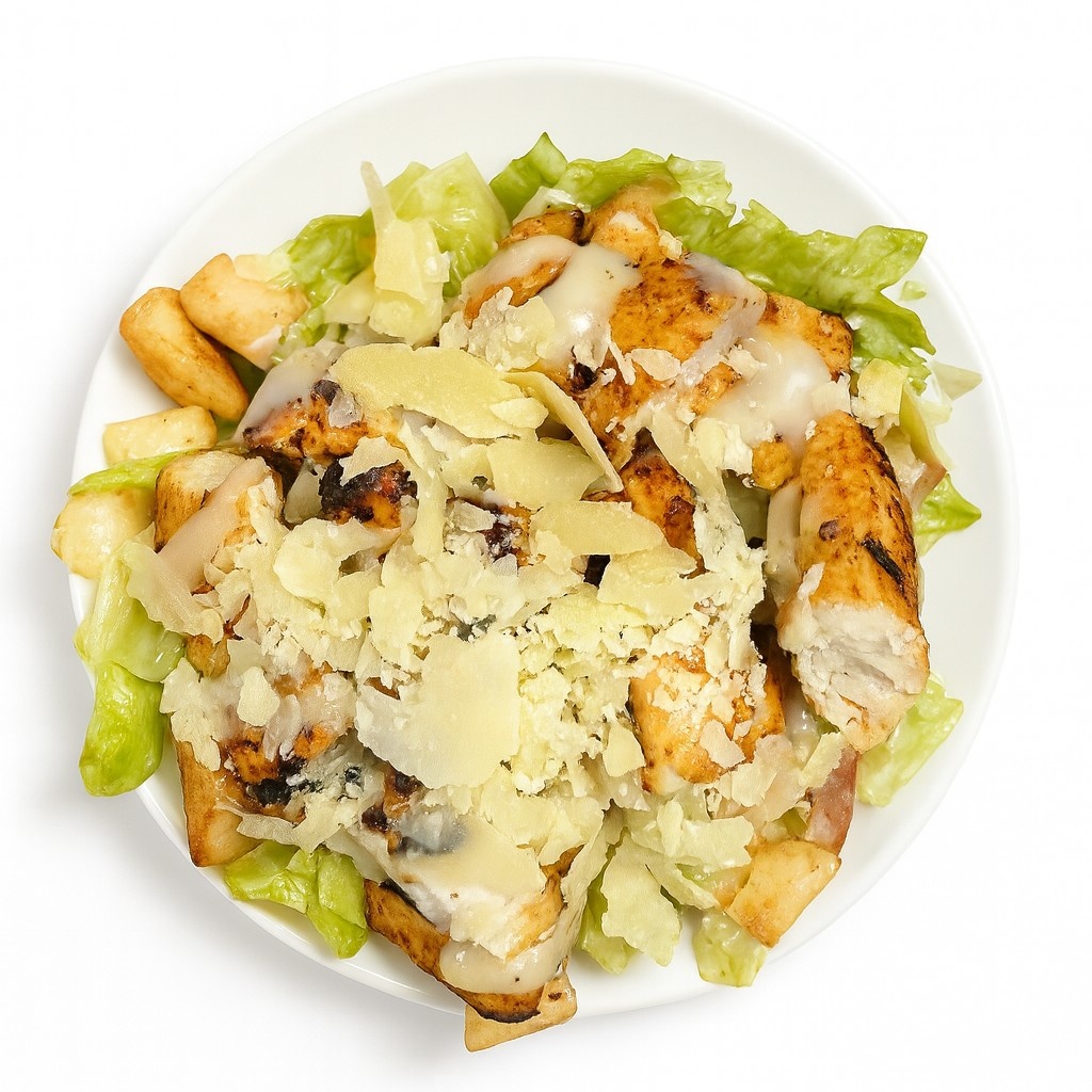 Chicken, Bacon, Croutons, Cos Lettuce, Caesar Dressing topped with Shaved ParmesanSalad OPT