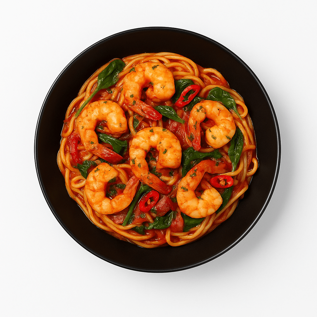 King Prawns, Garlic, Parsley, Fresh Chilli & Spinach in fresh Napoli SaucePasta Noodles
