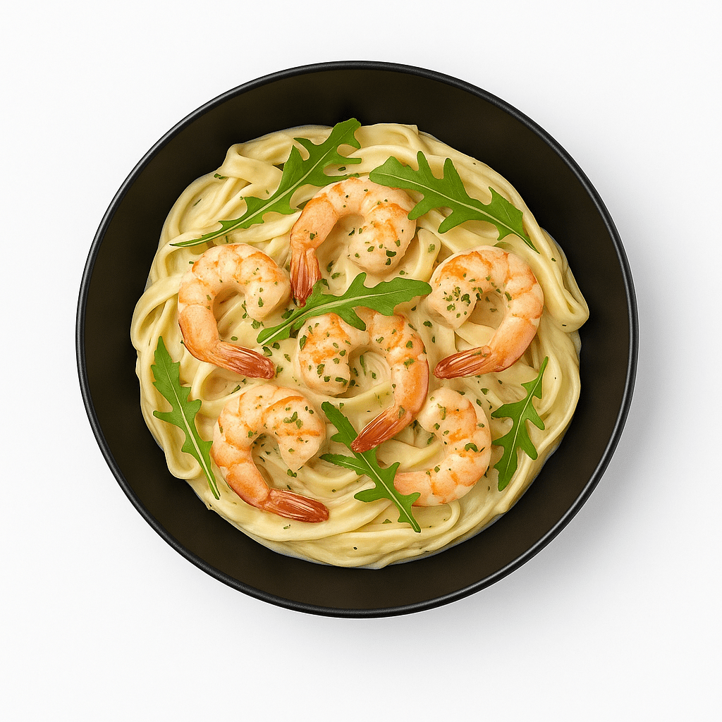 King Prawns, Garlic, Parsley, Spring Onion, Fresh Rocket, in a Creamy Lemony SaucePasta Noodles