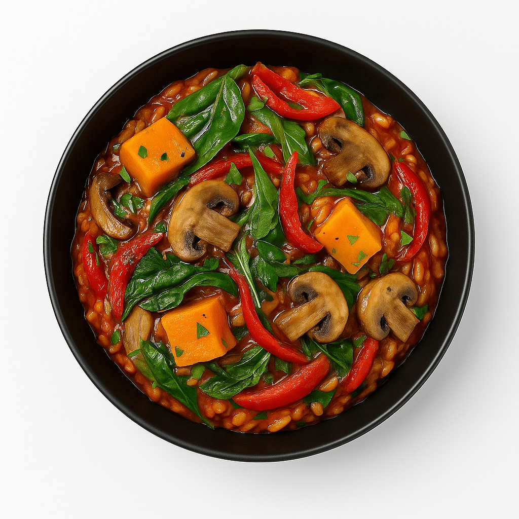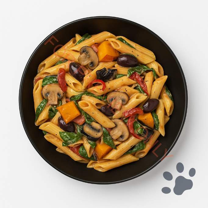 Mushroom, Onion, Pumpkin, Red Peppers, Eggplant & Spinach In Rose’ SaucePasta Noodles