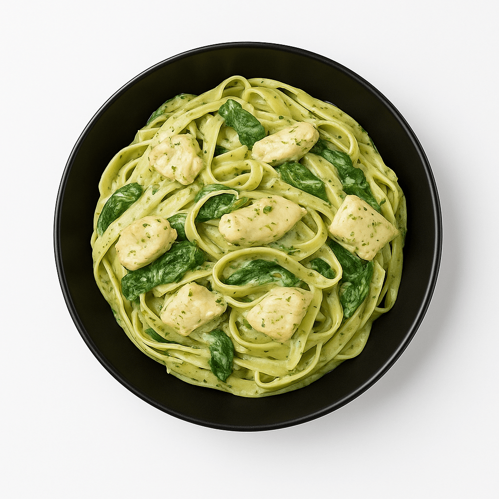 Chicken Breast, Spinach in Creamy Pesto SaucePasta Noodles